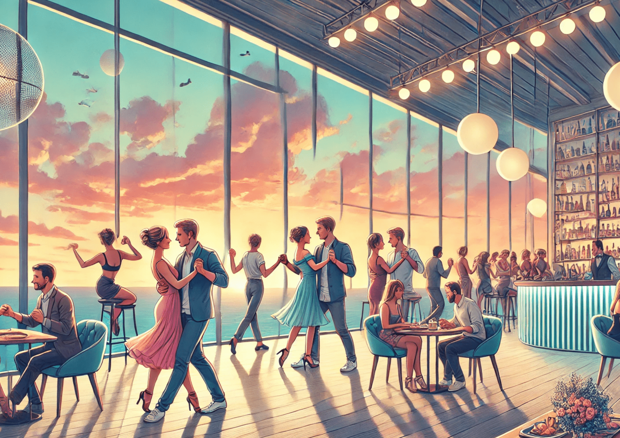 - Sunset bachata & salsa dancing with live DJ.