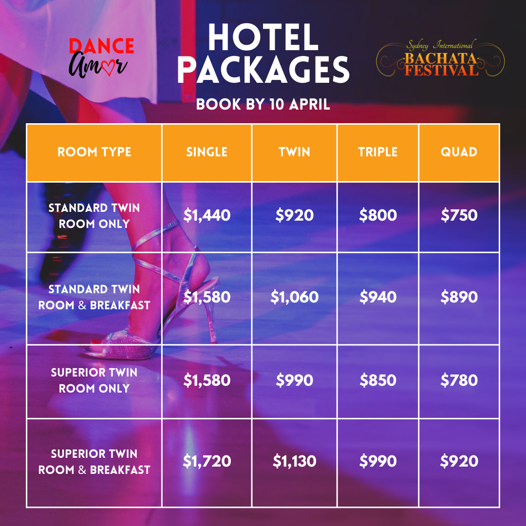 • 4 nights accommodation at our official Dance Amor hotel (Novotel West HQ)